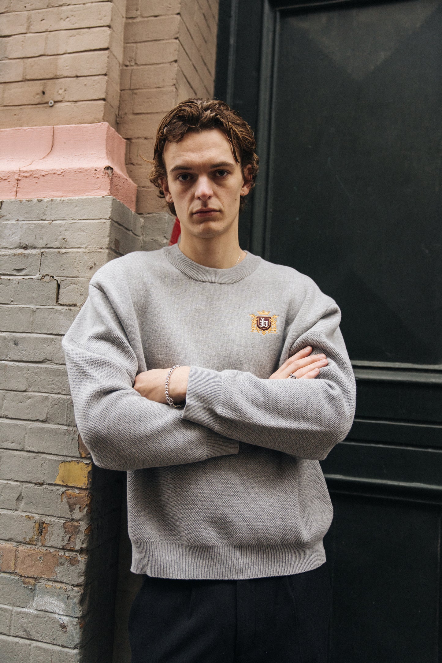bound Crest Panel Knit Sweater - Heather Grey