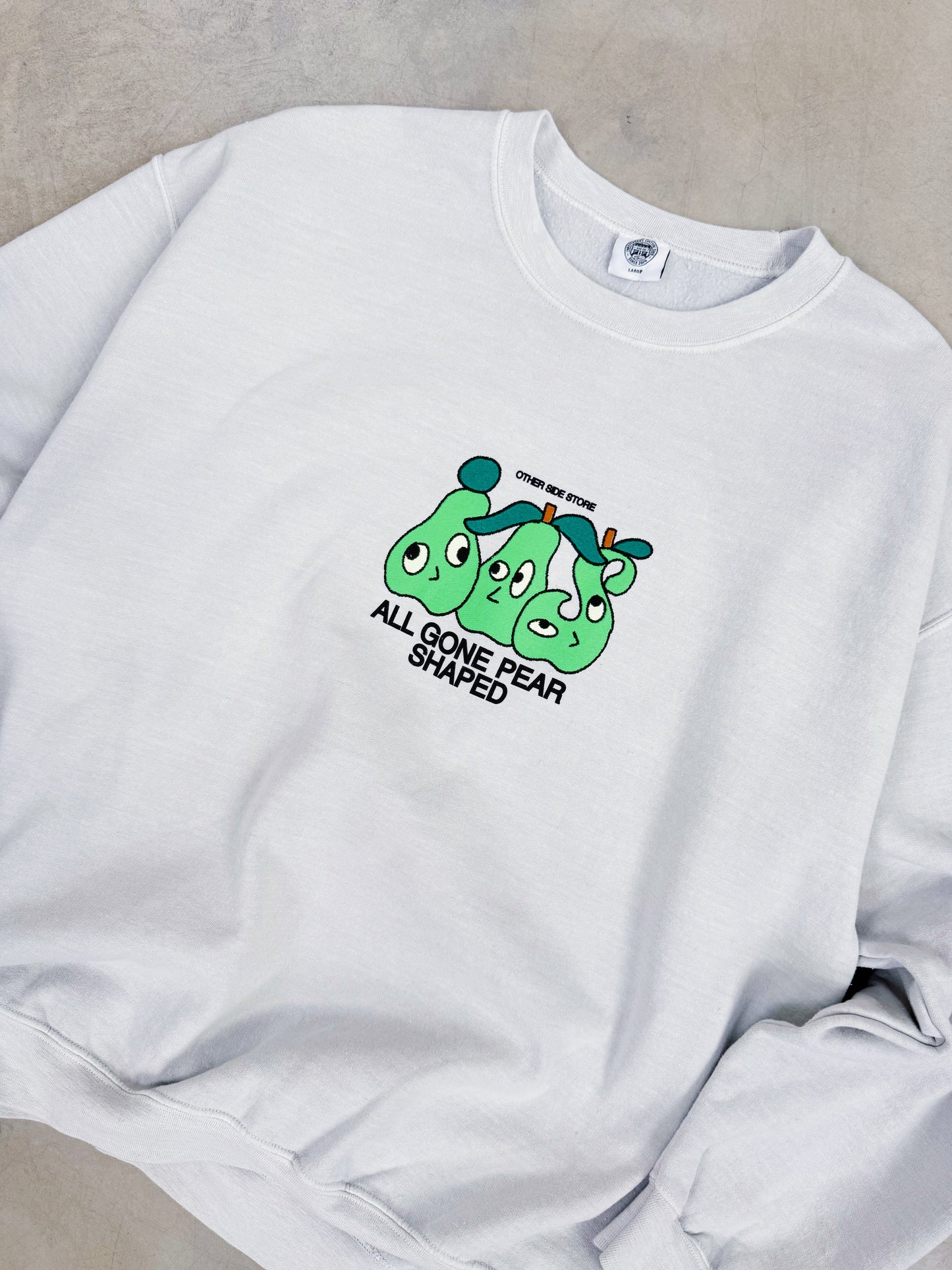 Brand new from Other Side Store 'Pear Shaped' Sweater in Vintage Washed Grey is a heavyweight, oversized crewneck made from ultra-soft, vintage-treated cotton fleece. Featuring a bold front graphic, it blends ironic streetwear attitude with everyday comfort. With its slouchy fit and gender-neutral design, it’s a go-to layer for effortless off-duty style.